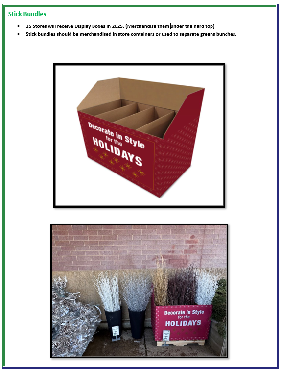 • Sticks bundles, pinecones, picks, etc. can be removed from store containers and worked on IGC tables to fill holes.